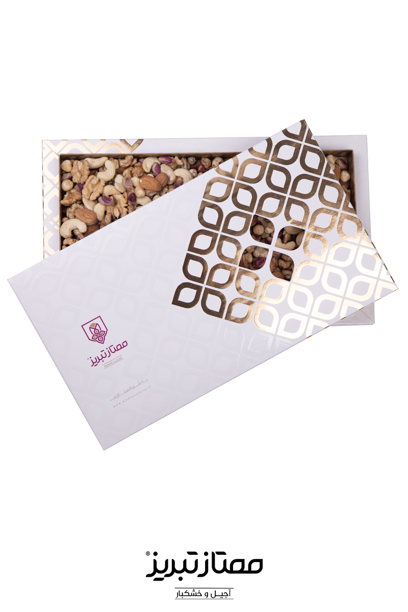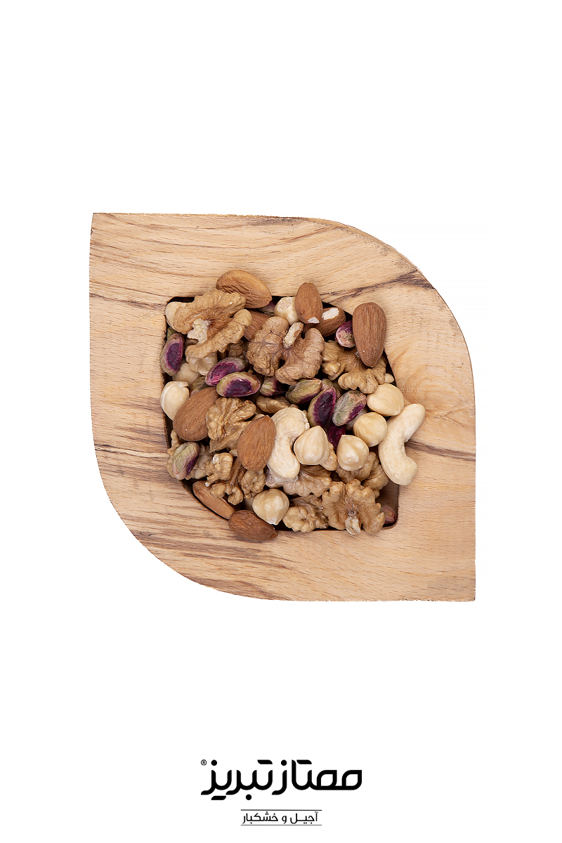 ترکیبات: مغز پسته کله قوچی دستچین - مغز بادام درختی نژاد آذر - بادام هندی دستچین - مغز گردو ایرانی - فندق سفید
