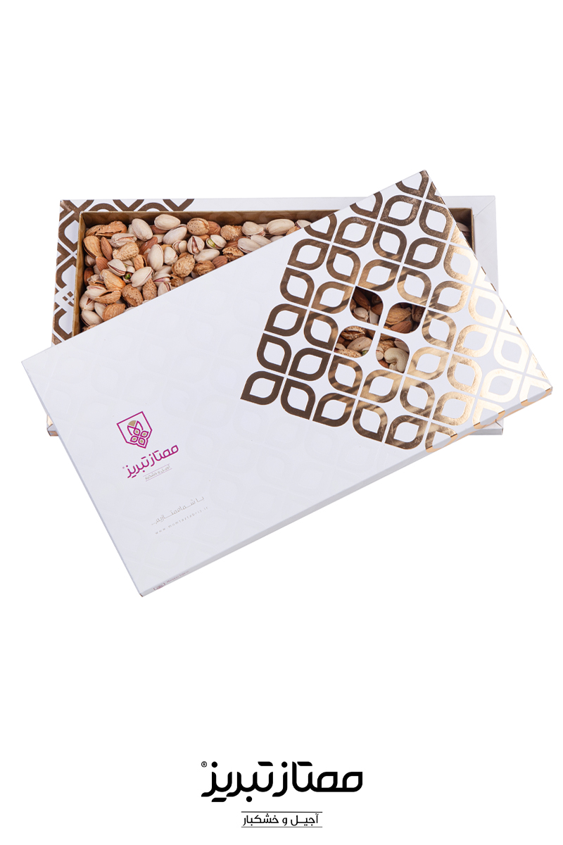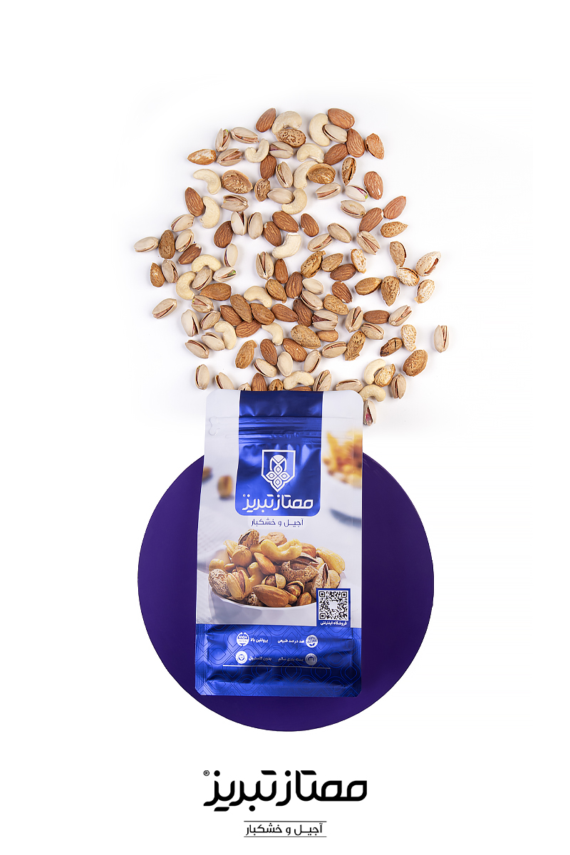 ترکیبات: پسته اکبری دستچین - مغز بادام درختی زرین - بادام هندی دستچین - بادام کاغذی مخصوص ایرانی