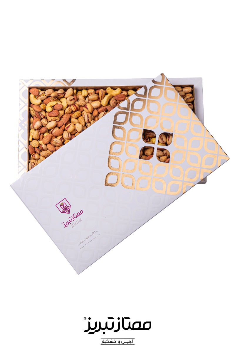 ترکیبات: پسته کله قوچی دستچین - بادام هندی دستچین - مغز بادام ایرانی نژاد آذر - بادام کاغذی مخصوص ایرانی